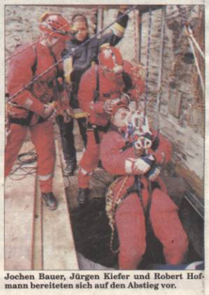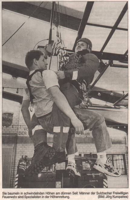 Hofmann ist seit drei Jahren als Höhenretter ausgebildet. Gemeinsam mit Kollege Marc Finger hat er 1997 die Landesfeuerwehr-Schule in Sachsen-Anhalt besucht und sich trainieren lassen. „Aus Eigeninteresse", wie er sagt. In der Schule hatte der Feuerwehrmann gelernt, wie er in einen Brunnen absteigt und sich von Wolkenkratzen abseilt, ohne sich in den Seilen zu verheddern oder hängen zu bleiben. Sitzen die Handgriffe, können die Retter rasch in Not geratene Menschen bergen; andererseits „garantiert das auch die eigene Sicherheit", sagt Marc Finger. Die Sulzbacher waren die ersten, die ein Team ausbilden ließen und sind bisher die einzige Wehr im Kreis mit Höhenrettungstrupp.