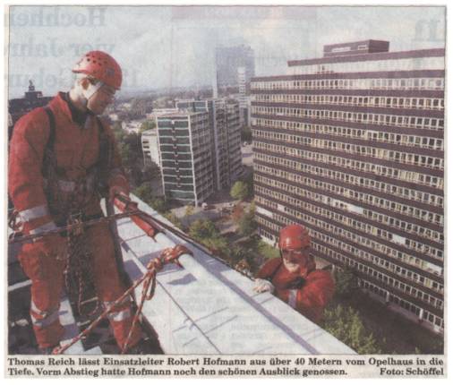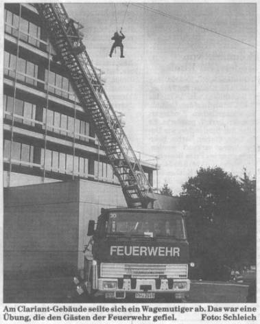 Spektakulär war das Abseilen der Höhenrettungs-Spezialisten vom Dach des Clariant-Gebäudes über eine Länge von 80 Metern über die Seile, die vergleichbar mit denen einer Seilbahn mit dem Einsatzfahrzeug als "Talstation" verbunden waren. Zunächst seilten sich wegen des starken Regens Thomas Reich und Wolfgang Opitz alleine ab, dann brachte Robert Hoffmann seinen Kameraden Jens Böhler als „Opfer“ hinunter.