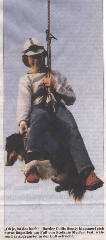 In Tragetaschen wurden die vierbeinigen Retter an Haken hochgezogen - mal mit, mal ohne Hundeführer. Ständige Leckerlis aus der Hand von Herrchen oder Frauchen halfen, den Tieren die Angst zu nehmen.