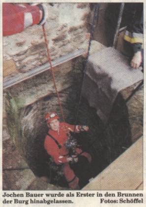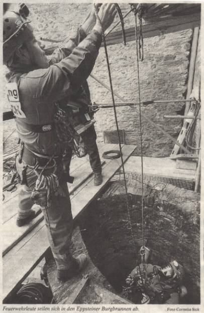 Die Männer der Höhenrettung Sulzbach freuten sich bei der Aktion vor allem über ein neues Übungsgebiet. „Das ist das erste Mal, das ich in einem Brunnen war", sagte Jochen Bauer. Er und zwei seiner Kollegen haben vor einem Jahr einen zweiwöchigen Lehrgang besucht, um sich als Höhenretter zu qualifizieren. Diese aus den neuen Bundesländern stammende Zusatzausbildung soll die freiwilligen Feuerwehrmänner vor allem für Einsätze auf Hochhäusern oder Kränen qualifizieren. 70 Übungsstunden am Seil müssen sie jährlich nachweisen. So stiegen die drei auch aus Eigeninteresse in den Eppsteiner Brunnen hinab. Kosten für die aufwendige Aktion stellten sie nicht in Rechnung, sie begnügten sich mit einer Spende des Museums der Burg Eppstein.