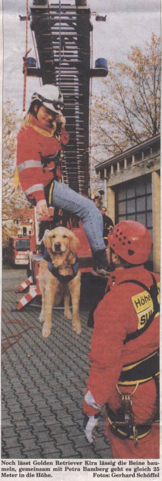 Sulzbach. Aufregung rund um das Feuerwehrgerätehaus: "Mutti, schau, da hängt ein Hund in der Luft", ruft ein Kind. Tatsächlich. Schon von weitem konnten die herbeigeeilten Schaulustigen einen Vierbeiner am Seil erkennen, und das in rund 25 Metern Höhe. Aber „Kira" hing nicht alleine in den Seilen. Mit dabei war Petra Bamberg, die zusammen mit ihrem erfahrenen Flächensuchhund langsam zu Boden glitt. Was aussah wie eine akute Rettungsaktion, entpuppte sich bald als außergewöhnliche Übung.