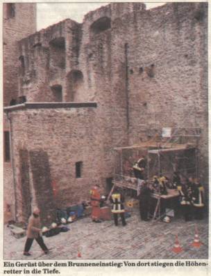 vh. EPPSTEIN. "Höhenrettung Sulzbach" steht in neongelben Buchstaben auf dem roten Anzug des jungen Mannes. An zwei Seilen gesichert, mit Gasmaske, Funkgerät und Helmleuchte ausgestattet, baumelt er in seinem Sitzgurt und deutet mit dem Finger in die Richtung, in die es nun gehen soll: nach unten. "Rotes Seil weiter nachgeben, Matze!", erschallt ein Kommando, und langsam entzieht sich Jochen Bauer den Blicken seiner Feuerwehrkollegen sowie einiger Neugieriger und steigt in den mittelalterlichen Brunnen von Burg Eppstein hinab.