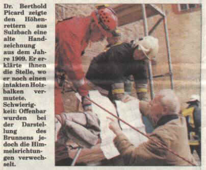 Eppstein. Stimmt der Plan, den Franz Burkhard 1909 zeichnete? Er stimmt nicht und Lokalhistoriker Dr. Bertold Picard hat nun wieder einmal etwas zum Grübeln. Burkhard hat offenbar die Himmelsrichtungen verwechselt. Die elf Höhenretter der Freiwilligen Sulzbacher Feuerwehr hingegen hatten eine spannende Aufgabe zu erklettern. Statt in die Höhe, ging es in die Tiefe - in den Burgbrunnen. Denn wo kann die Richtigkeit eines Planes überprüft werden? Einfach: Nur an Ort und Stelle. Weil das aber für einen Laien einfach nicht machbar ist, fragte Picard zunächst den Eppsteiner Wehrführer Ralf Großkopf um Rat. Großkopf verwies auf die Sulzbacher Spezialistentruppe (siehe Bericht auf dieser Seite). Jochen Bauer, Leiter der Höhenrettungsgruppe, fand das dies ein reizvoller Auftrag sei und so konnte das schwierige Unterfangen in Angriff genommen werden.